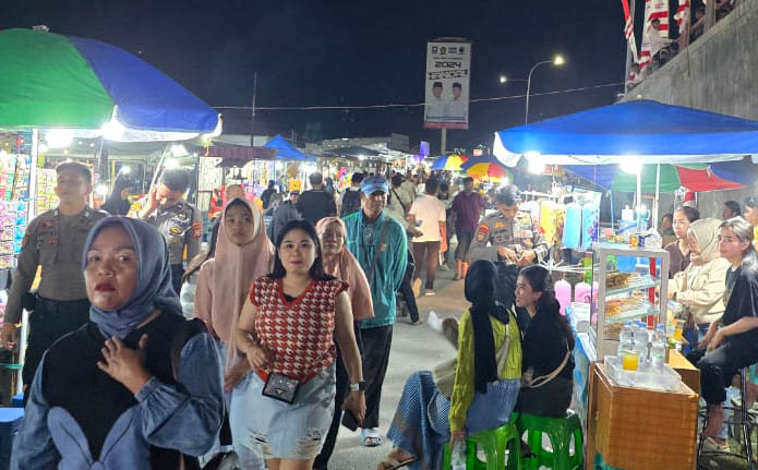 Sejumlah warga berjalan di area pesta rakyat Anwar-Reny bersama UMKM di lapangan Lalove, Nunu, Tatanga, Palu, Minggu (8/9/2024) malam. Foto: Tim Media BERANI