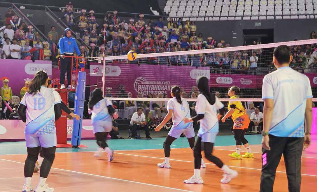 TIM bola voli Bhayangkari Kepolisian Daerah (Polda) Sulawesi Tengah, mengalahkan Bhayangkari Lampung 2-0 di Stadion Indoor Gelora Bung Karno, Jakarta, Sabtu (7/9/2024). Ini langkah baik mereka mengawali pertandingan 16 besar bola voli Bhayangkari Cup 2024.