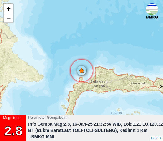 GEMPA bumi dengan magnitudo 2.8 mengguncang wilayah Barat Laut Tolitoli, Sulawesi Tengah, Kamis (16/1/2025) pukul 21.32 WIB atau 22.32 WITA.