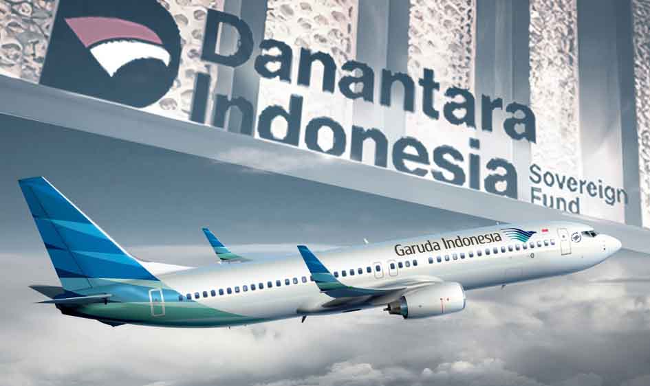 Logo Danantara Indonesia dan pesawat Garuda Indonesia. Foto: HO