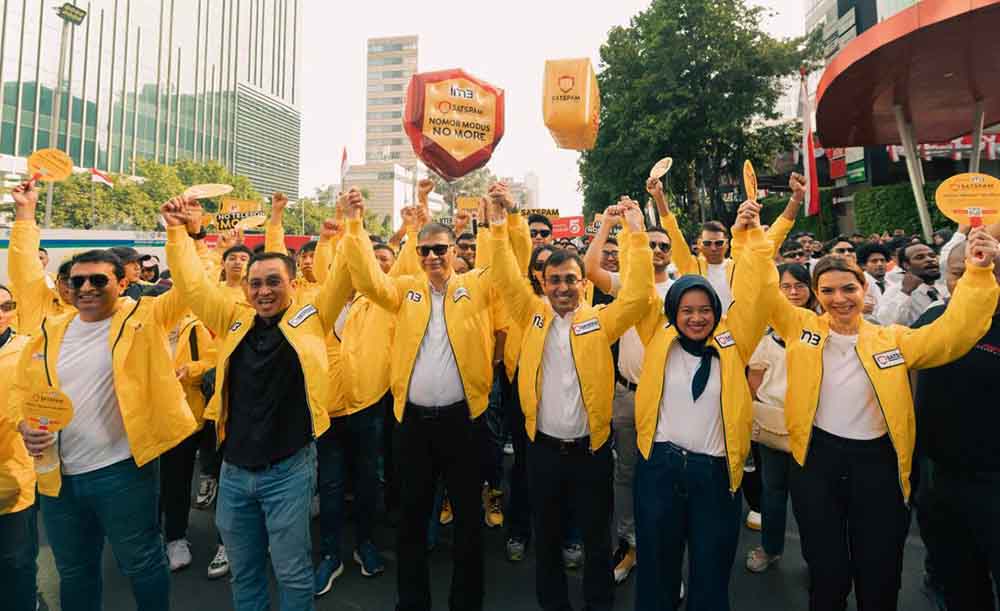 Indosat menggelar peluncuran SATSPAM di kawasan Car Free Day, Thamrin, Jakarta, Minggu (10/8/2025). Mereka menghadirkan parade bersama ratusan pasukan kuning, pimpinan Indosat, masyarakat, dan Najwa Shihab yang mendukung kampanye #NomorModusNoMore.
