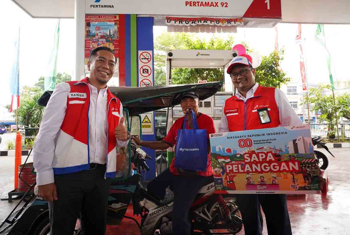 Mereka menyambut konsumen dengan salam kemerdekaan, membagikan bendera mini, merchandise, hingga mengajak masyarakat mendukung penggunaan produk Pertamina non-subsidi yang lebih berkualitas.