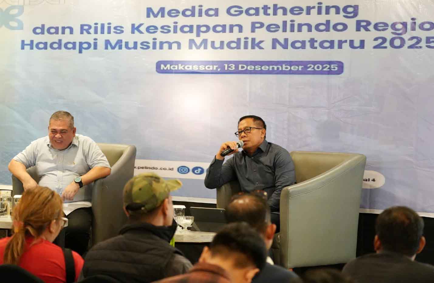 Executive Director 4 Pelindo Regional 4, Abdul Azis (kanan) didampingi Division Head Operasi Pelindo Regional 4, Yusida M Palesang mengikuti Media Gathering dan Rilis Kesiapan Pelindo Regional 4 hadapi Musim Mudik Nataru 2025/2026 di Makassar, Sabtu (13/12/2025). Foto: Humas Pelindo/Eranesia.id