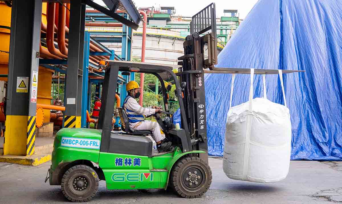 Pekerja PT QMB sedang mengoperasikan forklift listrik untuk memindahkan hasil produksi MHP ke gudang penyimpanan. Dok: Humas PT IMIP/Eranesia.id