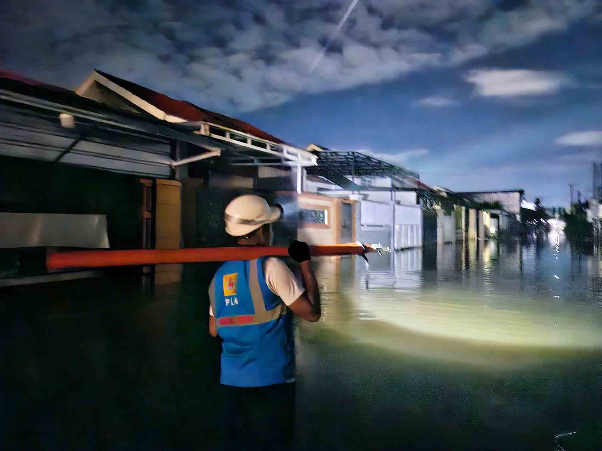 Meski banjir menghambat akses jalan, petugas PLN tetap siaga untuk memastikan pasokan listrik segera pulih.