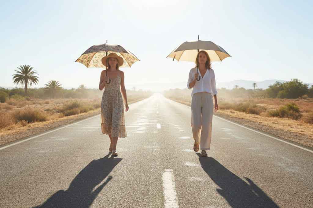 Ilustrasi dua wanita menggunakan payung saat terik matahari. Dok: AI/Eranesia.id