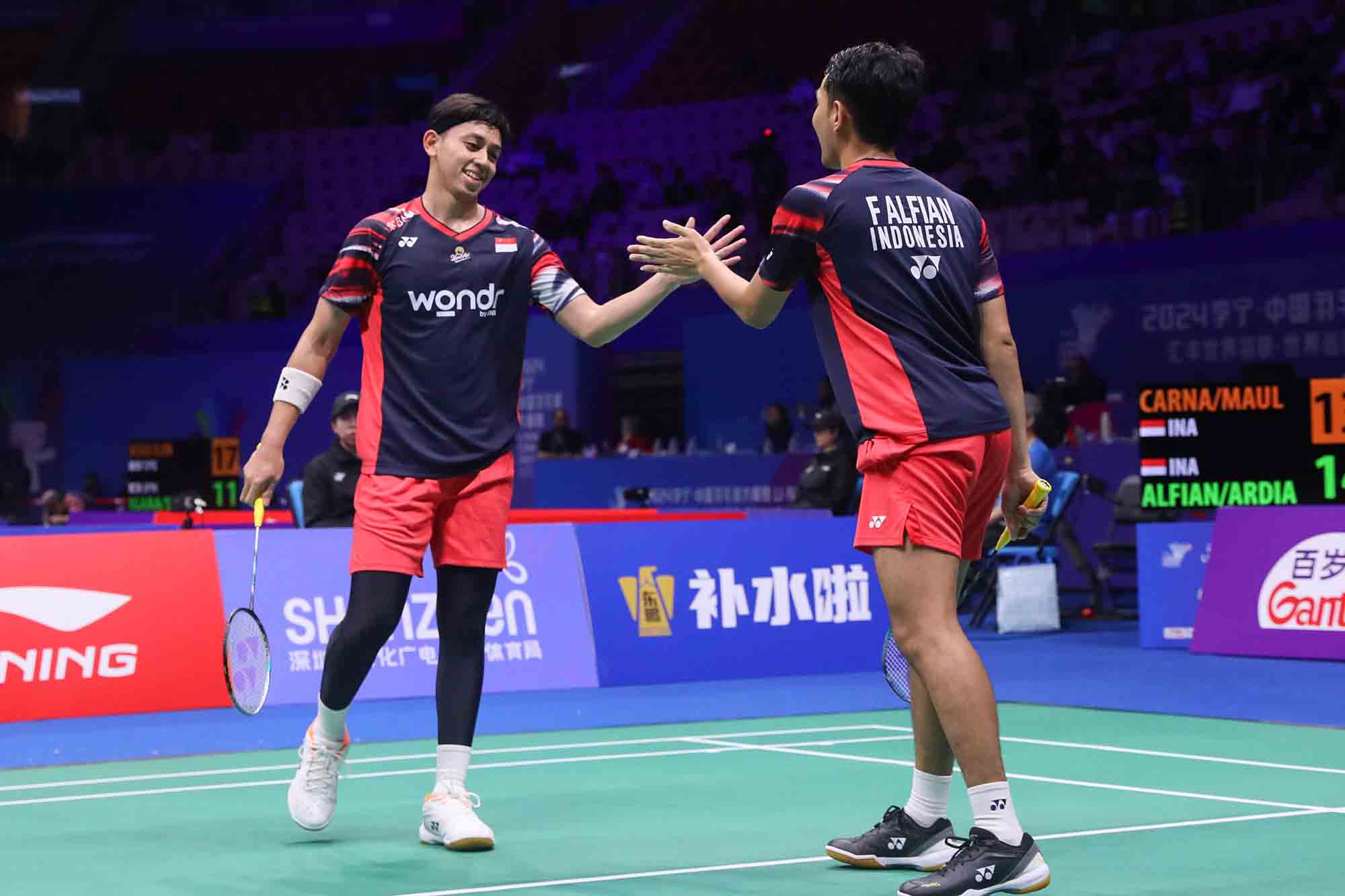 Pasangan Fajar Alfian/Muhammad Rian Ardianto menyingkirkan rekan senegara Leo Rolly Carnando/Bagas Maulana dalam pertandingan sengit tiga gim di turnamen bulutangkis China Masters 2024 di China, Rabu (20/11/2024). Foto: PP PBSI