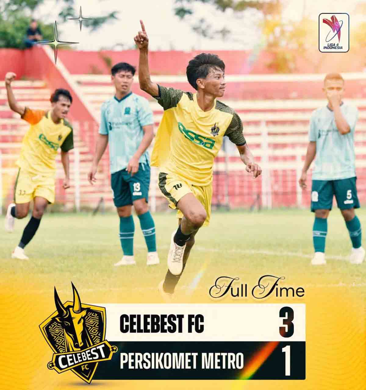 CELEBEST FC membuka langkahnya di Liga 4 Nasional dengan kemenangan gemilang. Tim asal Kota Palu, Sulawesi Tengah ini menaklukkan Persikomet Kota Metro Lampung dengan skor 3-1 dalam laga perdana yang digelar di Stadion Moch Sarengat, Kabupaten Batang, Jawa Tengah, Senin (21/4/2025).
