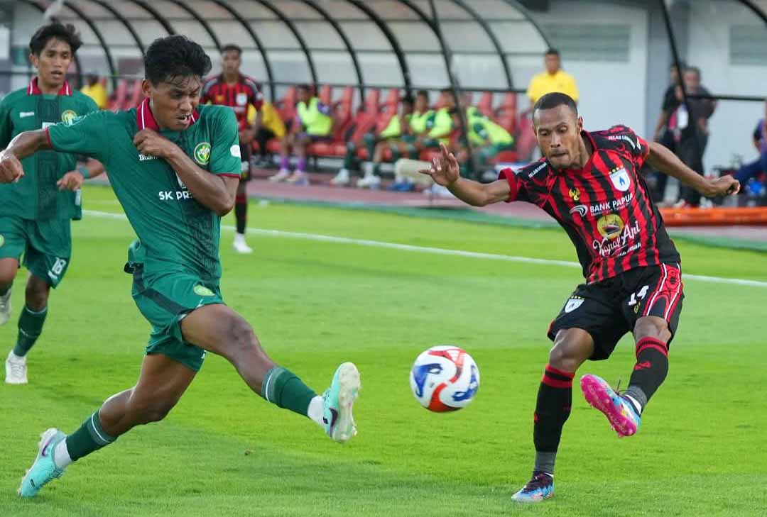 Pemain Persipal FC menendang bola yang berusaha dihadang pemain Persipura Jayapura pada laga perdana Championship 2025/2026 di Stadion Gelora BJ Habibie, Parepare, Sulawesi Selatan, Sabtu (13/9/2025). Pertandingan berlangsung ketat sejak awal hingga berakhir 0-0. Foto: Tim Humas Persipura Jayapura/Eranesia.id