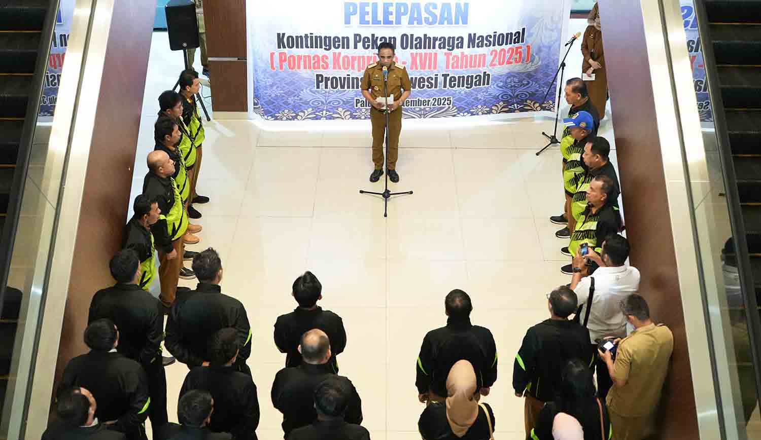 GUBERNUR Sulawesi Tengah, Anwar Hafid, melepas Kontingen Korpri Sulteng yang akan berlaga di Pekan Olahraga Nasional (Pornas) Korpri XVII, Selasa (30/9/2025), di Kantor Gubernur Sulteng.