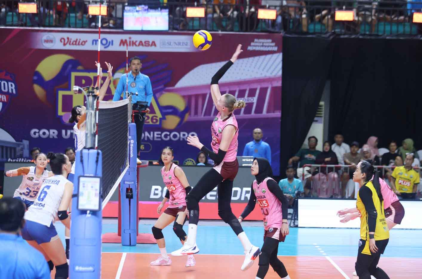 JUARA bertahan Jakarta Pertamina Enduro (JPE) makin kokoh di puncak klasemen setelah mengalahkan Jakarta Popsivo Polwan (JPP) dengan skor 3-1 (27-25, 19-25, 25-20, 25-21) pada lanjutan putaran kedua Proliga 2026, di GOR Utama, Bojonegoro, Minggu (15/2/2026).