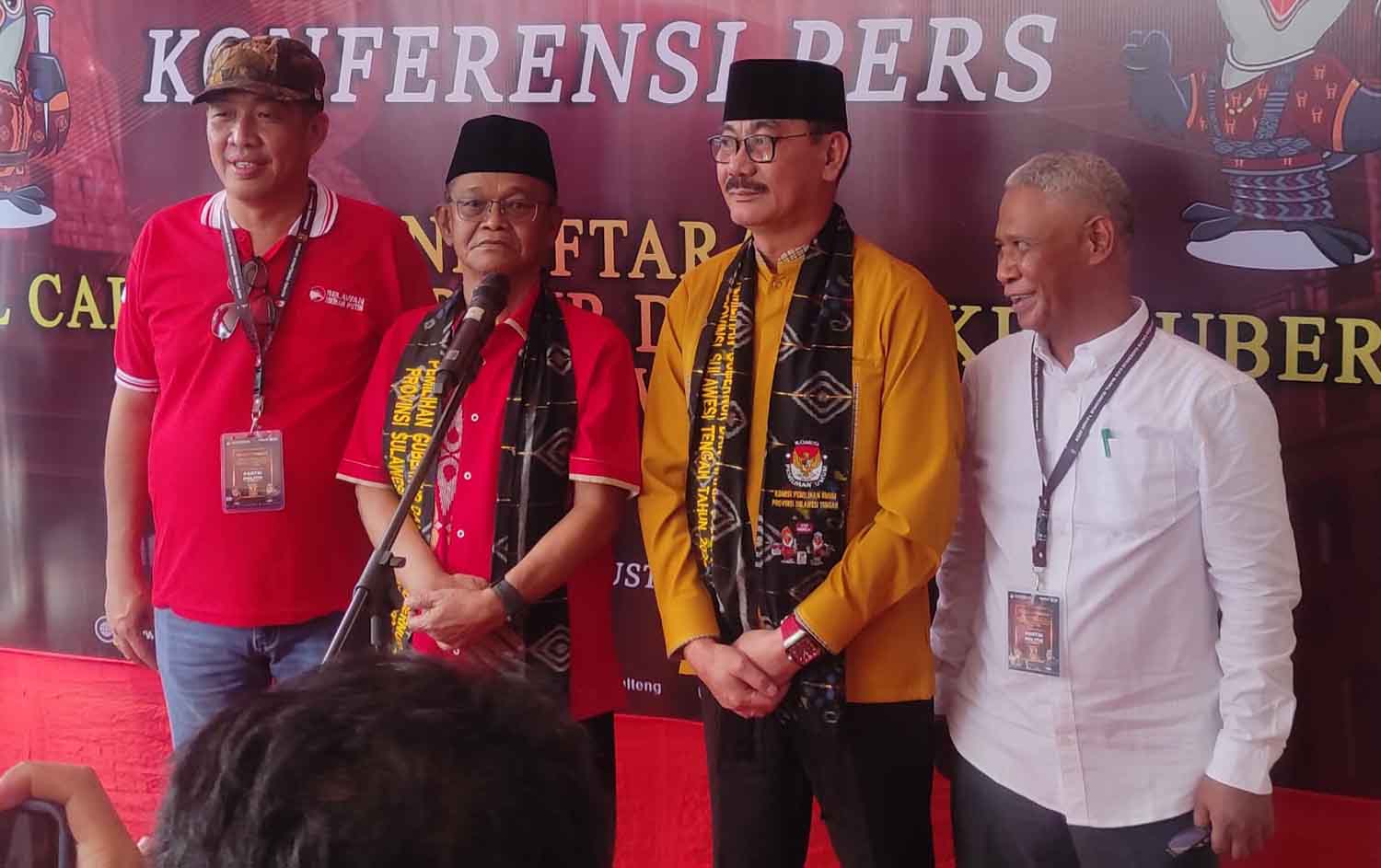 Pasangan calon Gubernur dan Wakil Gubernur, Rusdy Mastura-Sulaiman Agusto bersiap mengikuti konferensi pers seusai pendaftaran di KPUD Sulteng, Rabu (28/8/2024). Foto: Yamin untuk Eranesia.id