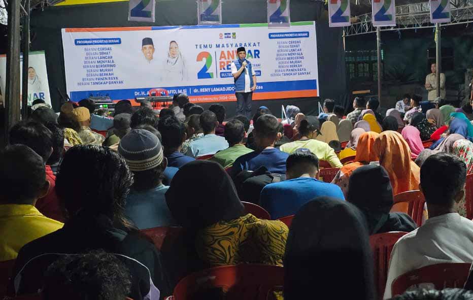 CALON gubernur Sulawesi Tengah nomor urut, Anwar Hafid disambut antusias masyarakat Desa Taopa, Kecamatan Taopa, Kabupaten Parigi Moutong, Senin (7/10/2024) malam.
