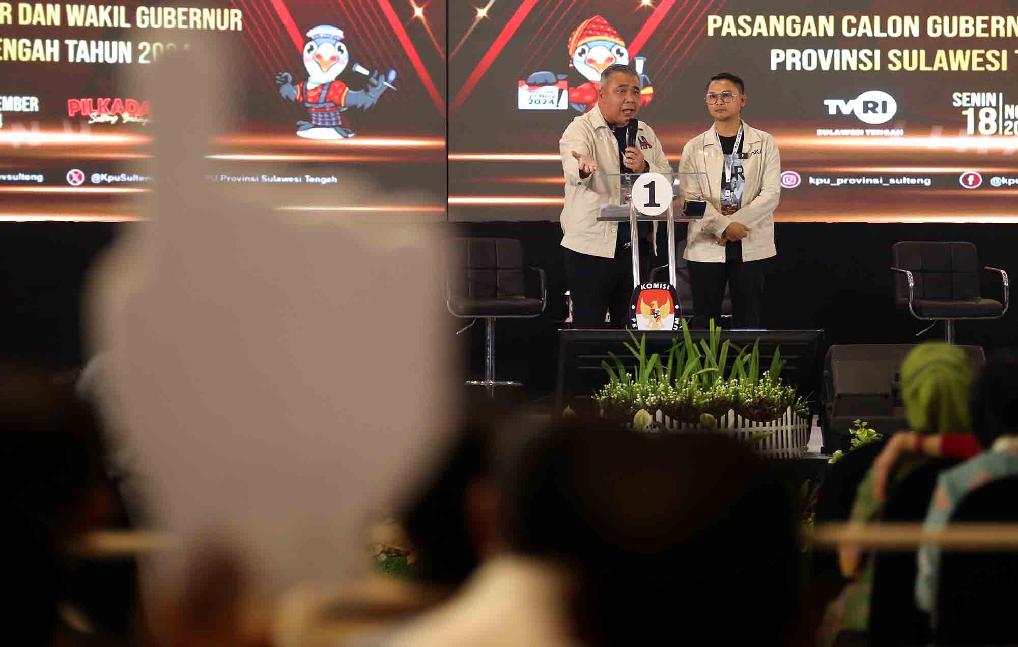 Calon Gubernur dan Wakil Gubernur Sulawesi Tengah nomor urut 1, Ahmad HM Ali - Abdul Karim Aljufri mengikuti debat kandidat terakhir yang diselenggarakan Komisi Pemilihan Umum Daerah (KPUD) provinsi itu di Palu, Senin (18/11/2024). Foto: Caesar DP/Eranesia.id