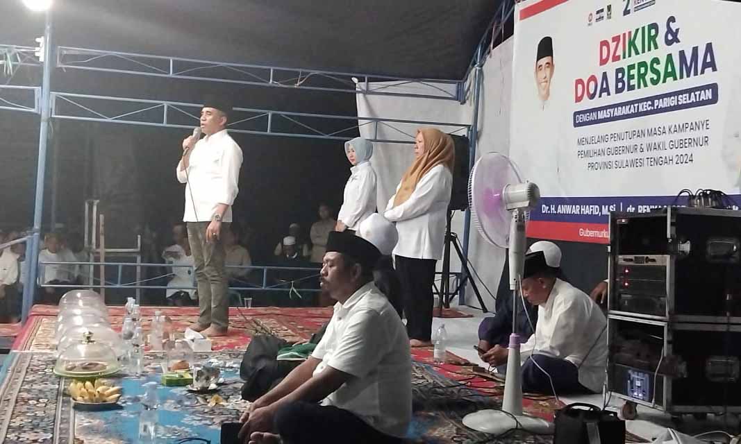 MENJELANG akhir masa kampanye, pasangan calon Gubernur dan Wakil Gubernur Sulawesi Tengah nomor urut 2, Anwar Hafid dan Reny Lamadjido, menggelar dzikir dan doa bersama di Desa Dolago, Kecamatan Parigi Selatan, Jumat (22/11/2024) malam.