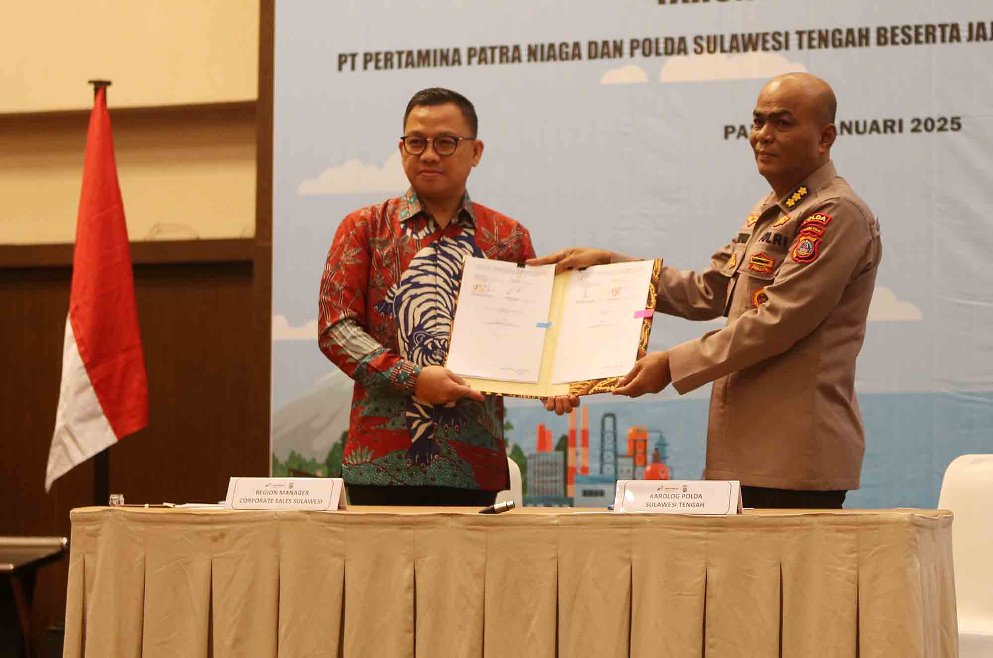 PT Pertamina Patra Niaga Region Sulawesi menandatangani perjanjian penyediaan bahan bakar minyak (BBM) dan pelumas dengan Polda Sulawesi Tengah untuk kebutuhan operasional Polri tahun 2025, Jumat (17/1/2025). Acara berlangsung di Hotel Santika, Palu, dengan pejabat tinggi Polda dan perwakilan Pertamina hadir dalam kegiatan tersebut.