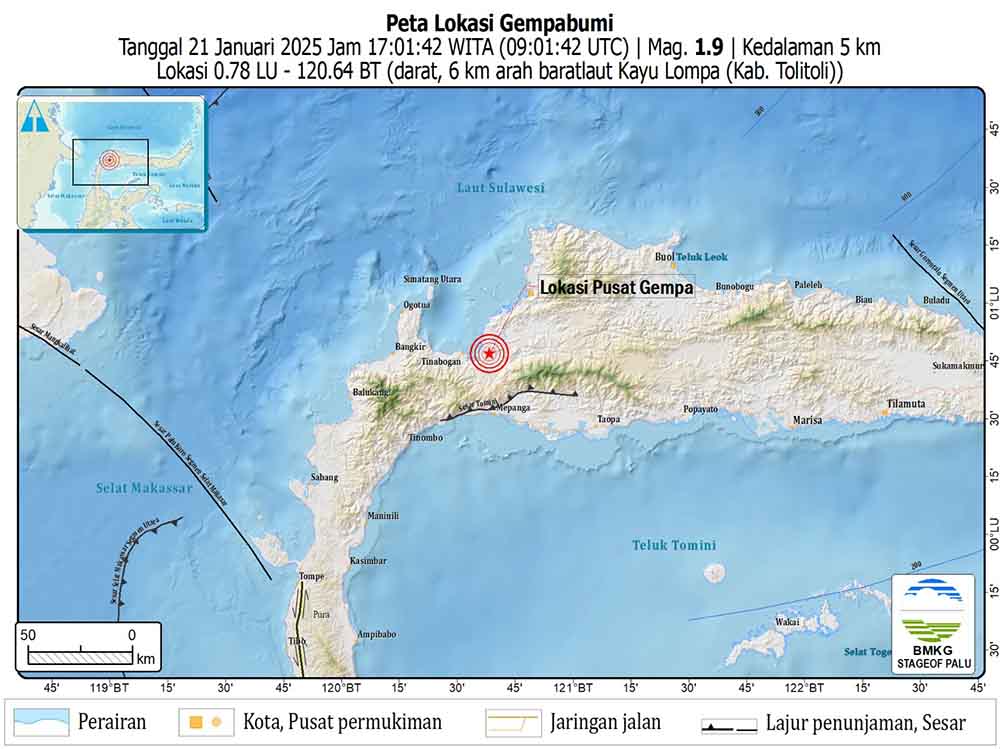 TOLITOLI, Sulawesi Tengah, mengalami gempa magnitudo 1,9, Senin (21/1/2025) pukul 17.01 WITA.