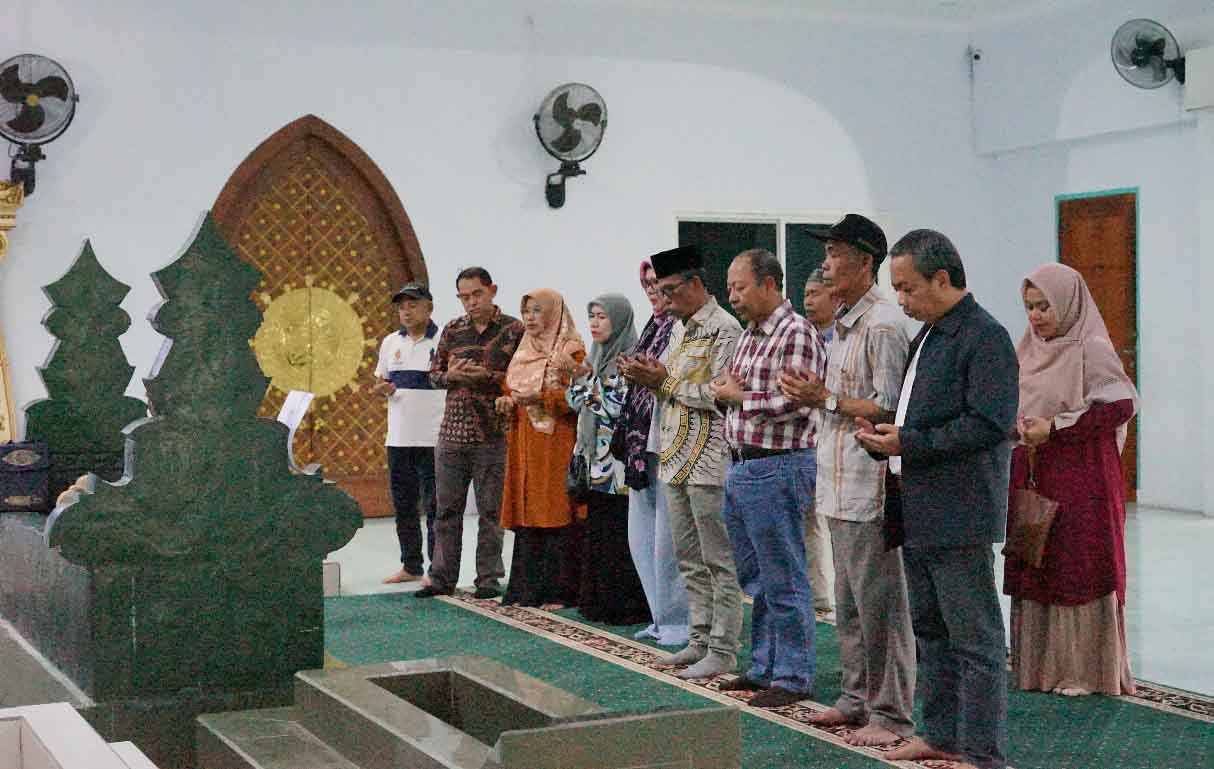 Rektor UIN Datokarama, Profesor Lukman S Thahir bersama dua asesor Lamdik dan rombongan berdoa di pusara Guru Tua di Jalan Sis Aljufri, Palu, Rabu (29/1/2025). Foto: Humas UIN Datokarama