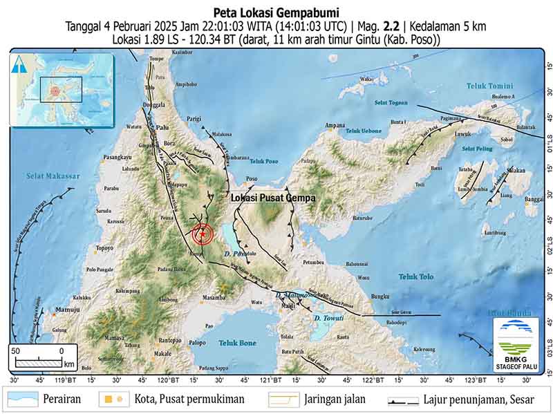 BADAN Meteorologi, Klimatologi, dan Geofisika (BMKG) melaporkan terjadinya gempa ringan di wilayah Kabupaten Poso, Sulawesi Tengah, Selasa (4/2/2025) malam.