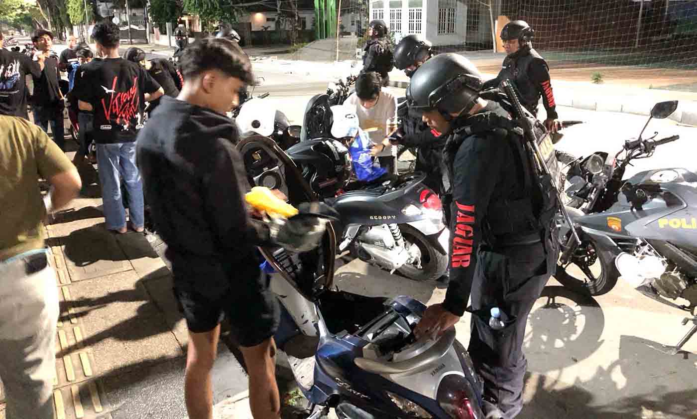 Tim Jaguar Sat Samapta Polres Palu memeriksa satu per satu kendaraan sejumlah remaja yang ditemukan berkumpul di lintasan lari lapangan Kantor Wali Kota Palu, Minggu (16/2/2025) dini hari. Foto: Humas Polres Palu
