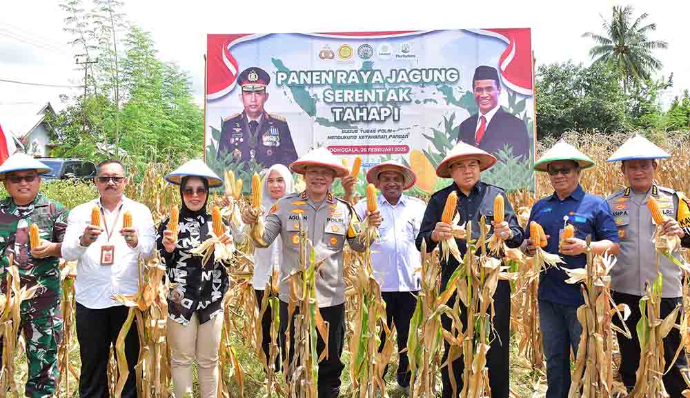 KAPOLDA Sulawesi Tengah, Irjen Agus Nugroho, memimpin panen raya jagung serentak tahap I di Desa Labuan Toposo, Kecamatan Labuan, Kabupaten Donggala, Rabu (26/2/2025). Panen ini menjadi bagian dari upaya mendukung swasembada pangan nasional.