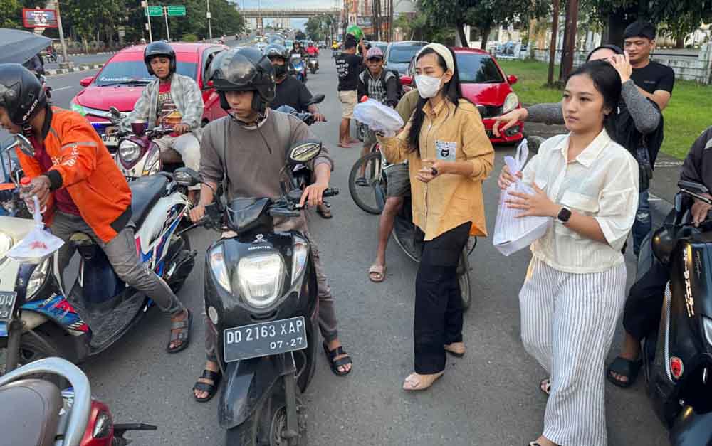 KOMUNITAS Family TikTok Nusantara (FTN) menggelar aksi sosial dengan membagikan takjil kepada pengguna jalan di sekitar Jalan Urip Sumoharjo, Kota Makassar, Sulawesi Selatan, Sabtu (8/3/2025). Kegiatan ini berlangsung mulai pukul 17.30 WITA sebagai bentuk kepedulian terhadap sesama di bulan Ramadan.