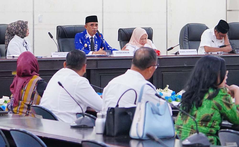 GUBERNUR Sulawesi Tengah, Anwar Hafid dan Wakil Gubernur Reny A Lamadjido menggelar rapat koordinasi dengan seluruh rektor perguruan tinggi negeri dan swasta di provinsi itu, Rabu (12/3/2025). Mereka menyelenggarakan kegiatan ini secara luring dan daring di ruang rapat polibu, kantor gubernur.