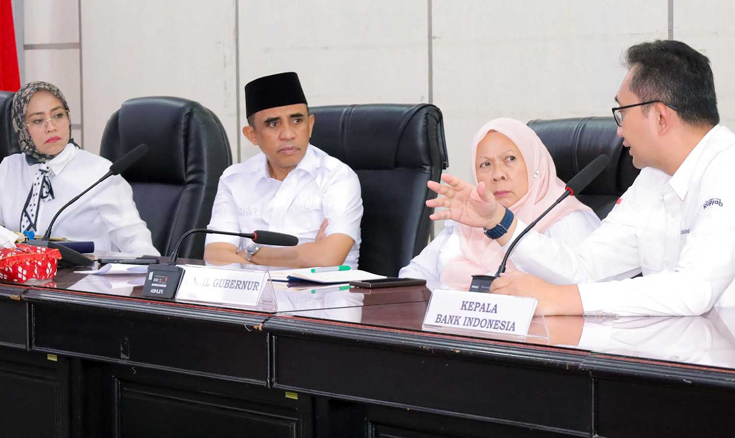 Gubernur Sulteng, Anwar Hafid (dua dari kiri) didampingi Wagub Sulteng, Reny A Lamadjido (dua dari kanan), dan Sekprov Sulteng, Novalina (kiri) mendengarkan penjelasan Kepala KPwBI Sulteng, Rony Hartawan saat rapat penyusunan RPJMD 2025-2030 di Ruang Rapat Polibu, Kantor Gubernur di Palu, Rabu (12/3/2025). Foto: AH Media Center
