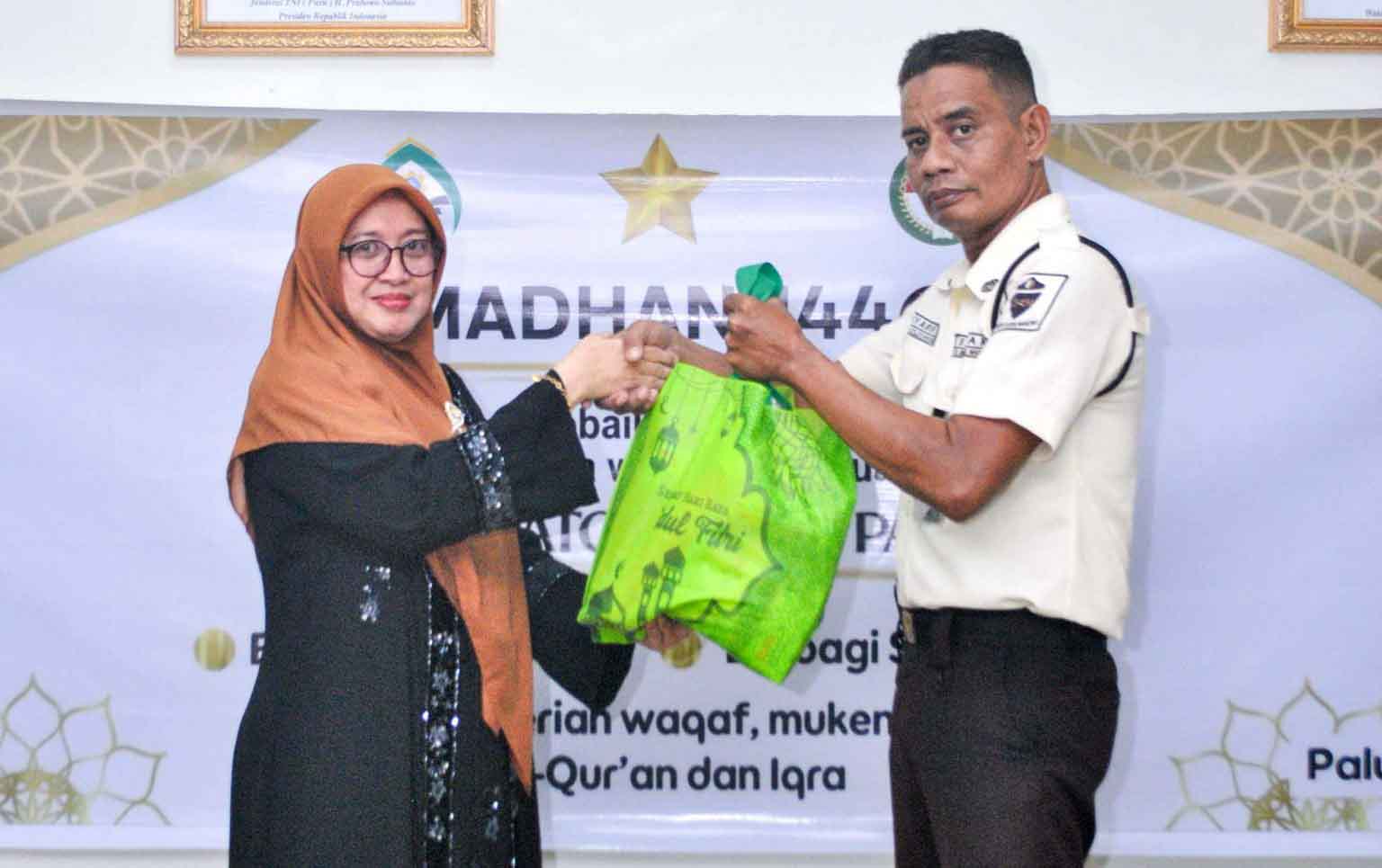 Ketua DWP UIN Datokarama, Faidah Lukman memberikan bantuan paket cembalo kapad salah satu petugas keamanan kampus di Palu, Rabu (19/3/2025). Foto: Humas UIN Datokarama Palu/HO