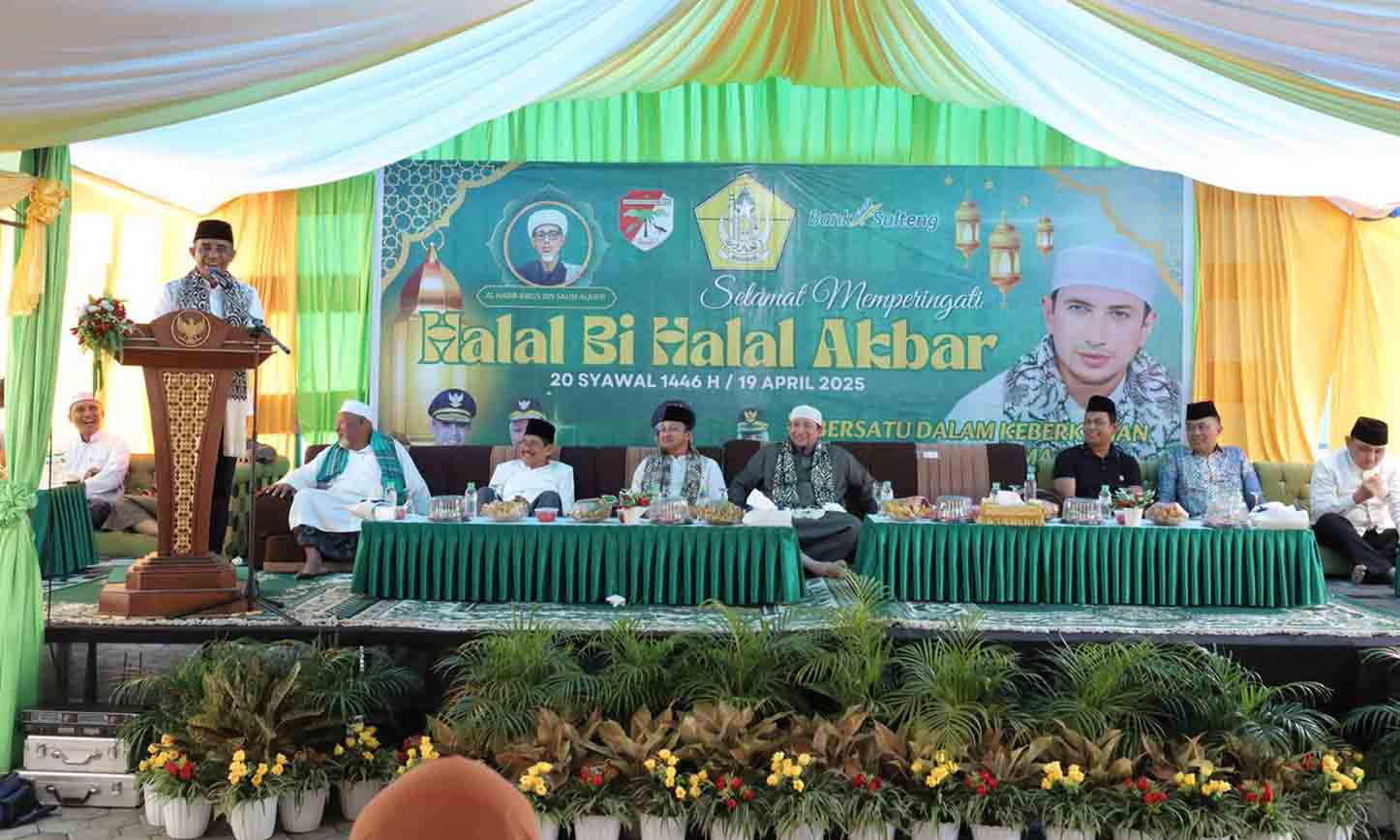 GUBERNUR Sulawesi Tengah, Anwar Hafid, bersama Ketua TP-PKK, Sry Nirwanti Bahasoan, menghadiri Halal Bi Halal Akbar 1446 H dan Haul Guru Tua yang Komisariat Daerah (Komda) Alkhairaat Tojo Unauna (Touna) selenggarakan di Masjid Ismaratul Ukhuwwah, kabupaten itu, Sabtu (19/4/2025).