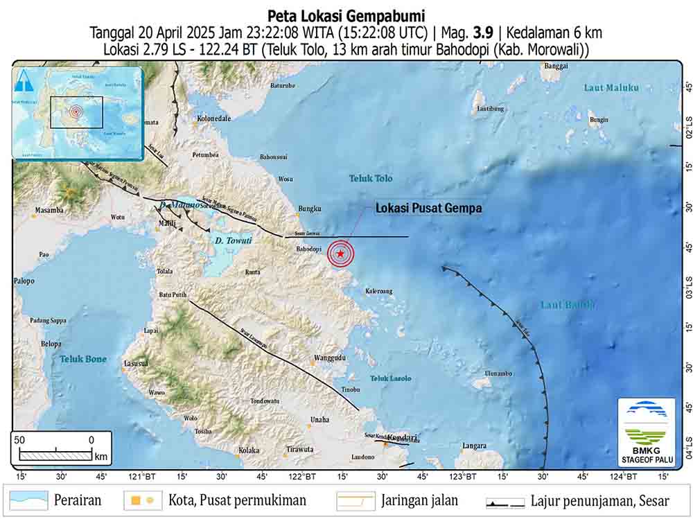 GEMPA bumi berkekuatan magnitudo 3,9 mengguncang wilayah Teluk Tolo, Bahodopi, Morowali, Sulawesi Tengah, Minggu (20/4/2025) malam pukul 23.22 WITA.