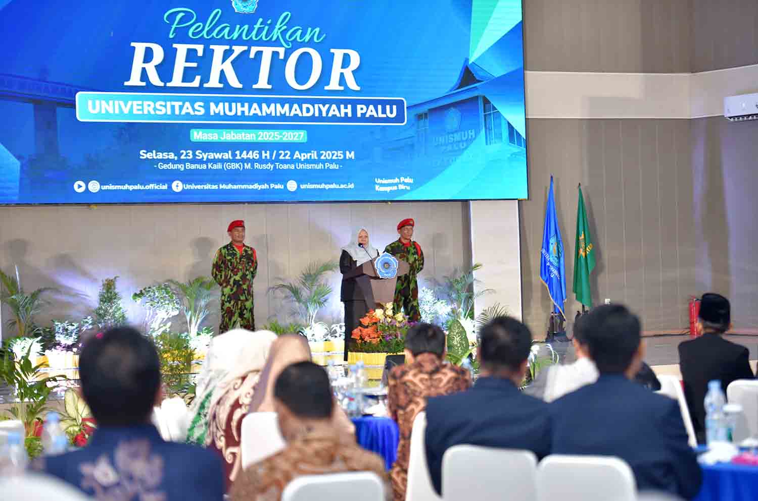 WAKIL Gubernur Sulawesi Tengah, Reny A Lamadjido, menghadiri pelantikan Rektor Universitas Muhammadiyah (Unismuh) Palu periode 2025–2027 di Gedung Banua Kaili (GBK), Unismuh Palu, Selasa (22/4/2025).