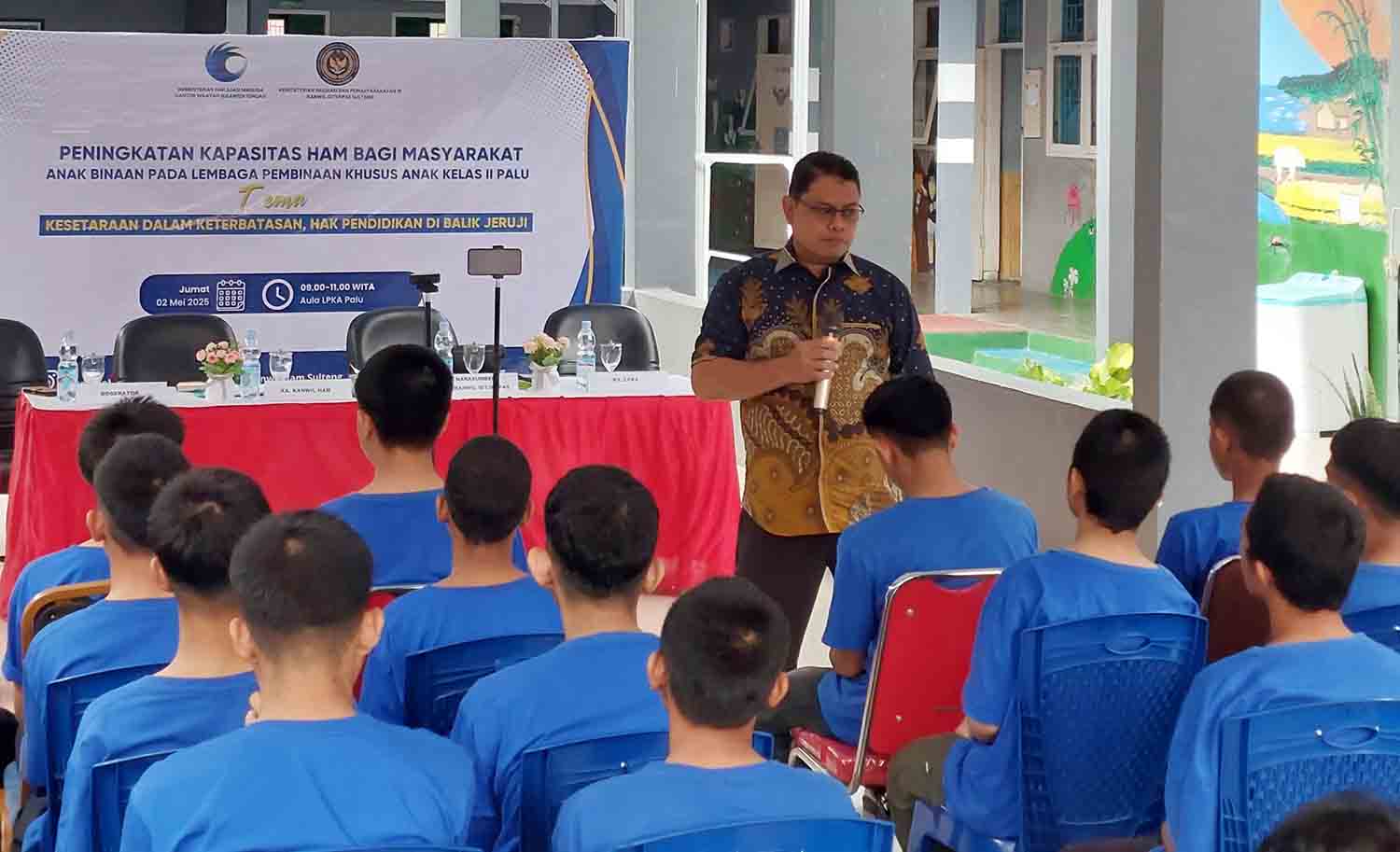Kepala Kantor Wilayah Direktorat Jenderal Pemasyarakatan (Kakanwil Ditjenpas) Sulawesi Tengah, Bagus Kurniawan, tampil sebagai narasumber dalam kegiatan penguatan kapasitas Hak Asasi Manusia (HAM) di LPKA Palu, Jumat (2/5/2025).