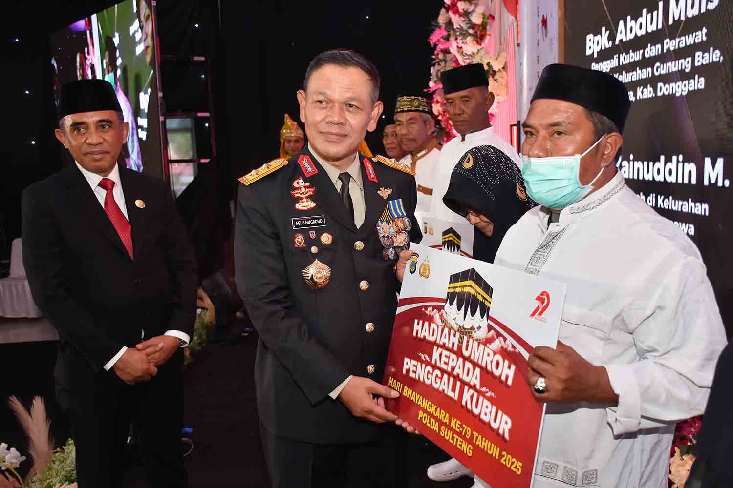 Kapolda Sulteng, Irjen Agus Nugroho didampingi Gubernur Sulteng, Anwar Hafid memberikan hadiah umrah kepada penggali kubur di saat kegiatan syukuran Hut Bhayangkara ke 79 di Aula Pogombo, Kantor Gubernur Sulteng, Selasa (1/7/2025). Foto: HO