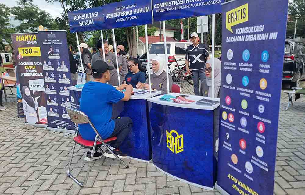 MASYARAKAT Kota Palu mendapat kesempatan istimewa. Mereka bisa berolahraga sambil mengakses layanan dan informasi hukum di Lapangan Vatulemo, Minggu (10/8/2025). Kantor Wilayah Kementerian Hukum Sulawesi Tengah (Kanwil Kemenkum Sulteng) melalui Divisi Pelayanan Hukum membuka stan layanan di area car free day.