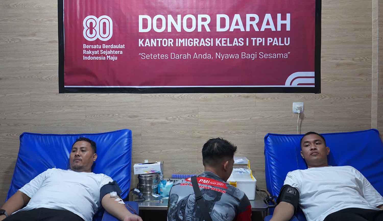 KANTOR Imigrasi Kelas I TPI Palu menggelar donor darah di Kantor Palang Merah Indonesia (PMI) Sulawesi Tengah, Jumat (15/8/2025). Kegiatan ini dalam rangka memeriahkan HUT ke-80 Kemerdekaan Republik Indonesia.