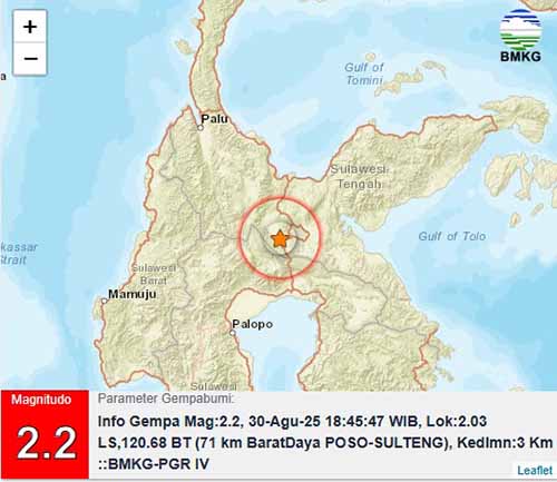 BADAN Meteorologi, Klimatologi, dan Geofisika (BMKG) melaporkan gempa bumi bermagnitudo 2,2 terjadi di wilayah Kabupaten Poso, Sulawesi Tengah, Sabtu (30/8/2025) pukul 18.45 WIB atau 19.45 WITA.