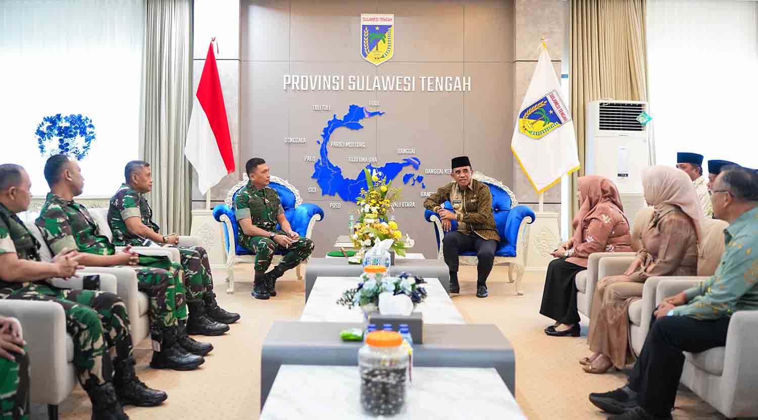 GUBERNUR Sulawesi Tengah, Anwar Hafid, bersama jajaran menyambut silaturahmi Pangdam XXIII/Palaka Wira, Mayjen Jonathan Binsar Parluhutan Sianipar, di ruang kerjanya, Kamis (4/9/2025). Pertemuan berlangsung hangat dan penuh semangat membangun sinergi antara pemerintah daerah dan TNI.