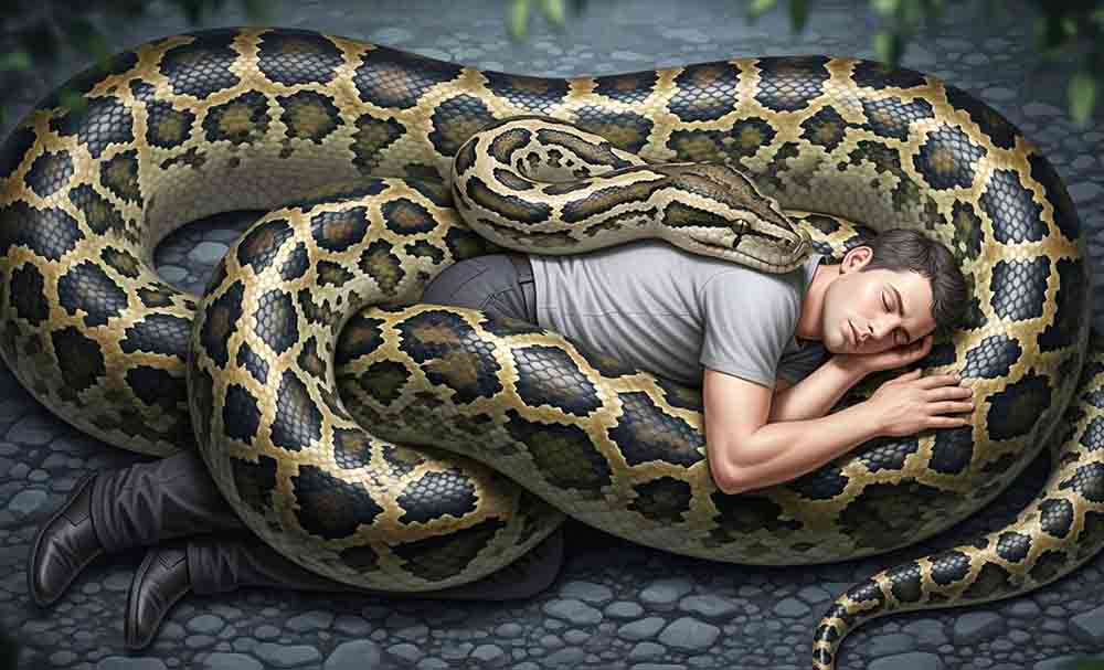 Ridwan terbangun karena tubuhnya dililit erat oleh piton. Sambil berteriak meminta pertolongan, ia berusaha melepaskan diri. Namun, ular itu justru menggigit bahunya hingga membuatnya tak sadarkan diri.