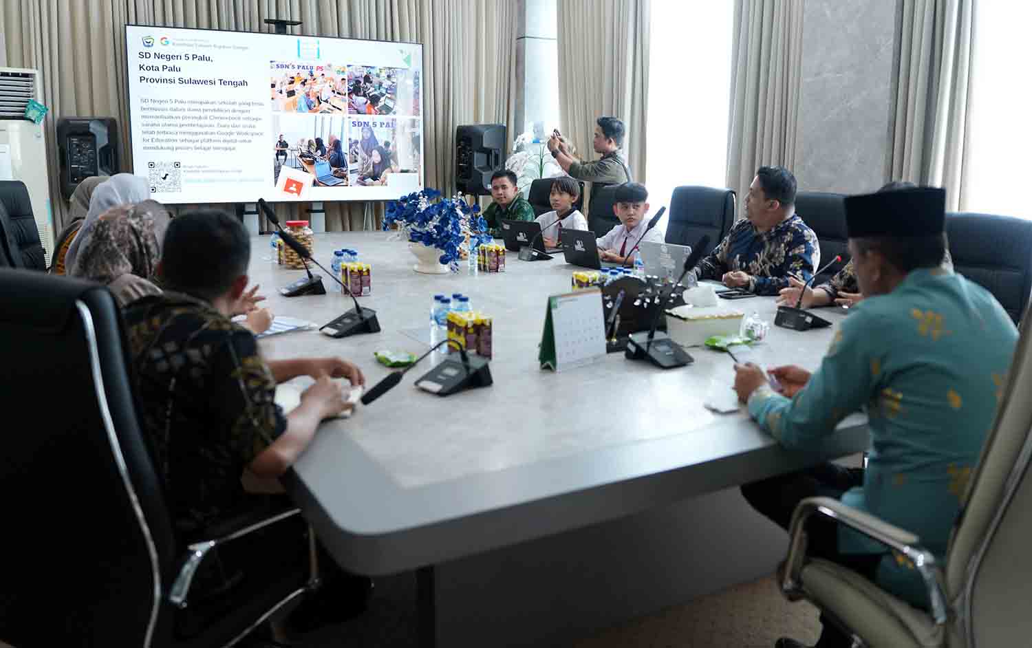 Perwakilan Google for Education, Tifani dan Surya, hadir bersama perwakilan sekolah, siswa SDN 5 Palu, Yudiawati V. Windarrusliana, serta Plt Kepala Diskominfosantik Sulteng, Wahyu Agus Pratama.