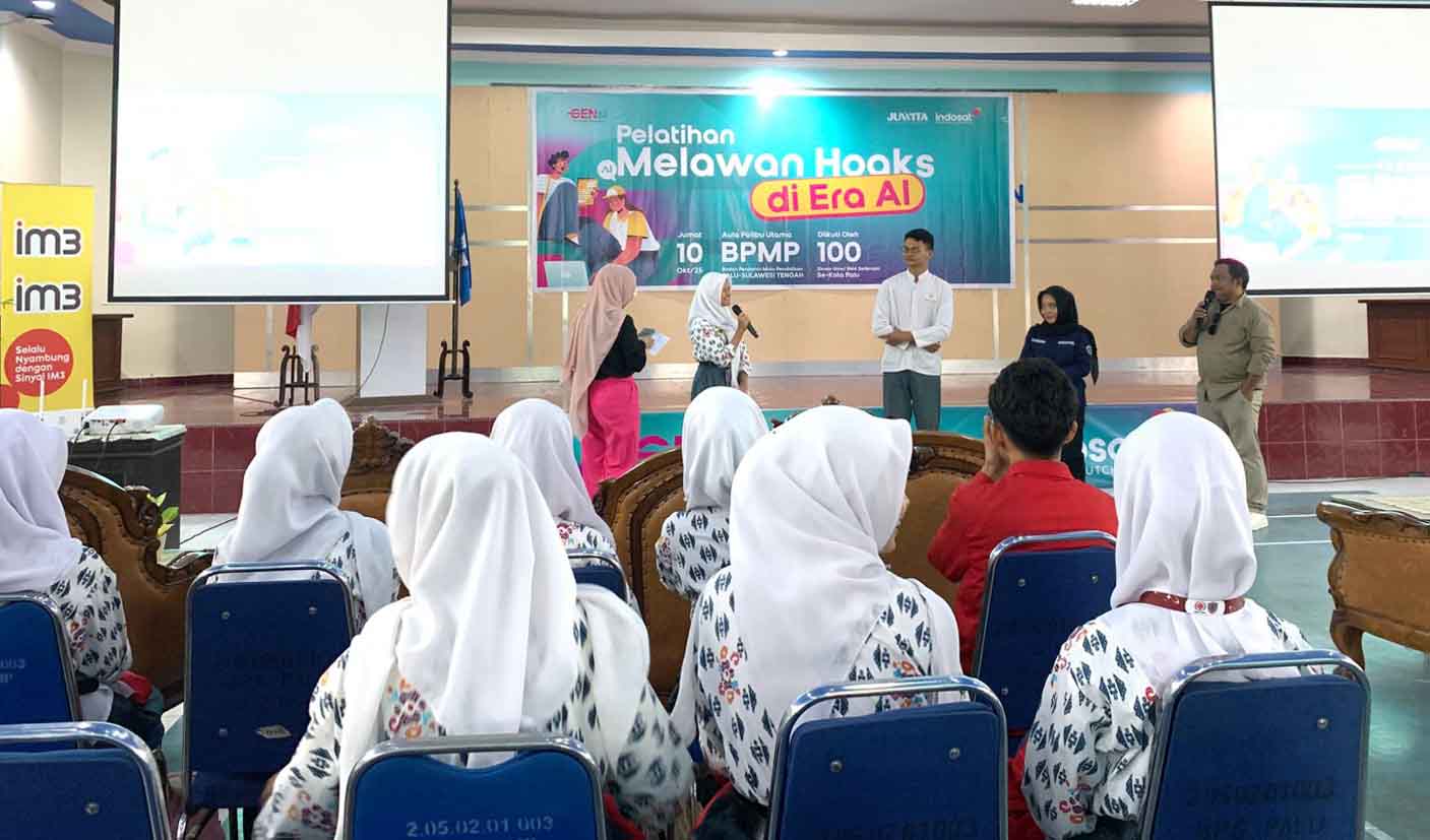 JURNALIS Wanita (JUWITA) bekerja sama dengan Indosat Ooredoo Hutchison (IOH) menggelar pelatihan Melawan Hoaks di Era AI di Aula BPMP Kota Palu, Jumat (10/10/2025). Kegiatan ini diikuti pelajar SMA sederajat se-Kota Palu.