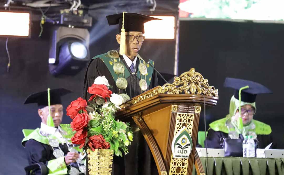 Rektor UIN Datokarama, Profesor Lukman S Thahir memberi sambutan pada wisuda ke-45 sarjana, magister, dan doktor di Kota Palu, Minggu (2/11/2025). Foto: Humas UIN Datokarama/Eranesia.id