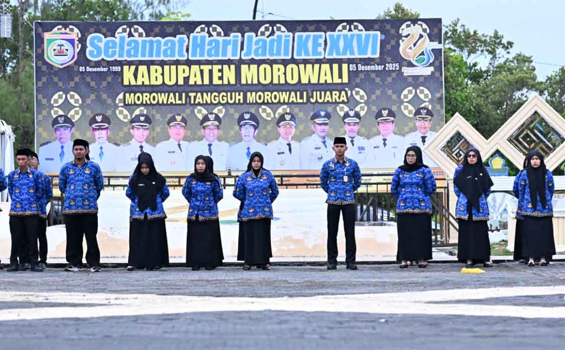 ASN mengikuti upacara peringatan HUT ke-26 Kabupaten Morowali di Alun-Alun Rumah Jabatan Bupati Morowali, Jumat (5/12/2025). Foto: Biro Adpim/Eranesia.id