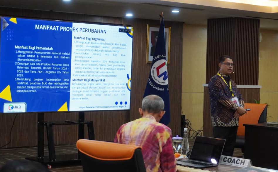 Kepala Kanwil Ditjenpas Sulteng, Bagus Kurniawan memaparkan proyek perubahan bertajuk “Dari Narapidana Menjadi Wirausaha” dalam rangkaian Pelatihan Kepemimpinan Nasional Tingkat I (PKN TK-I) Angkatan LXV yang digelar Lembaga Administrasi Negara. Foto: Humas Kanwil Ditjenpas Sulteng/Eranesia.id