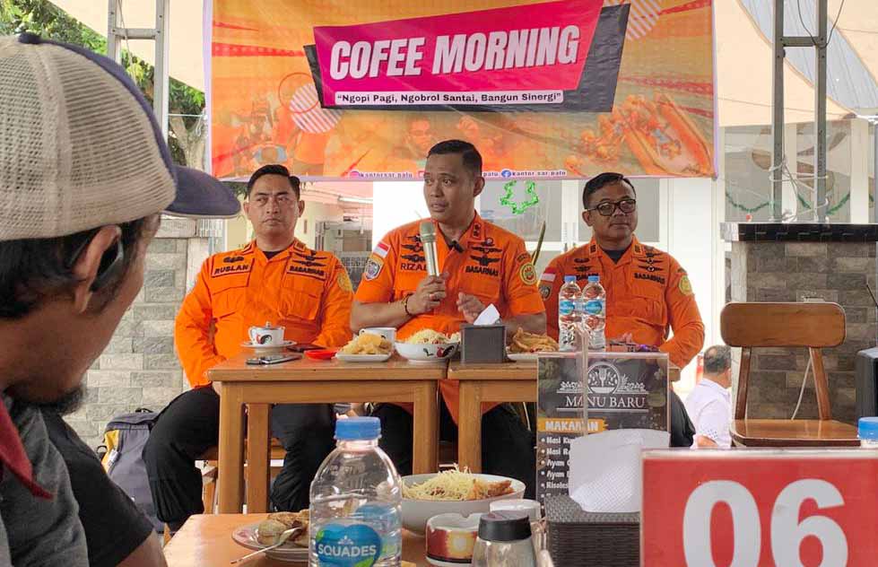 Kepala Kantor Pencarian dan Pertolongan (Basarnas) Palu, Muh Rizal (tengah) memimpin konfrensi pers terkait pengamanan Natal 2025 dan Tahun Baru 2026 di salah satu warung kopi di Palu, Rabu (24/12/2025). Foto: Rusdia/Eranesia.id