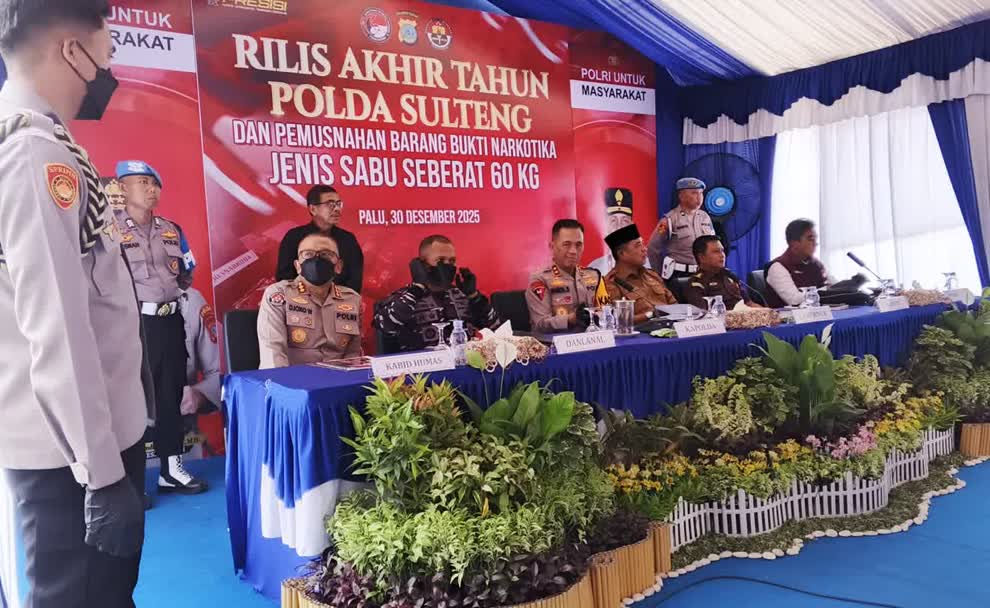 KEPALA Kepolisian Daerah (Kapolda) Sulawesi Tengah, Irjen Endi Sutendi, memimpin konferensi pers akhir tahun 2025 yang sekaligus dirangkaikan dengan pemusnahan narkotika jenis sabu-sabu seberat sekitar 60 kilo gram. Kegiatan berlangsung di Lobi Utama Polda Sulteng, Selasa (30/12/2025).