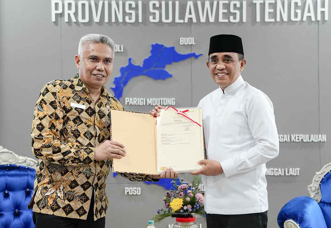 GUBERNUR Sulawesi Tengah, Anwar Hafid, menerima penyerahan sertifikat tanah aset pemerintah daerah dari Kepala Kantor Wilayah Badan Pertanahan Nasional (BPN), Muhammad Naim, Jumat (9/1/2026). Kegiatan ini bagian dari upaya pengamanan dan penertiban aset.