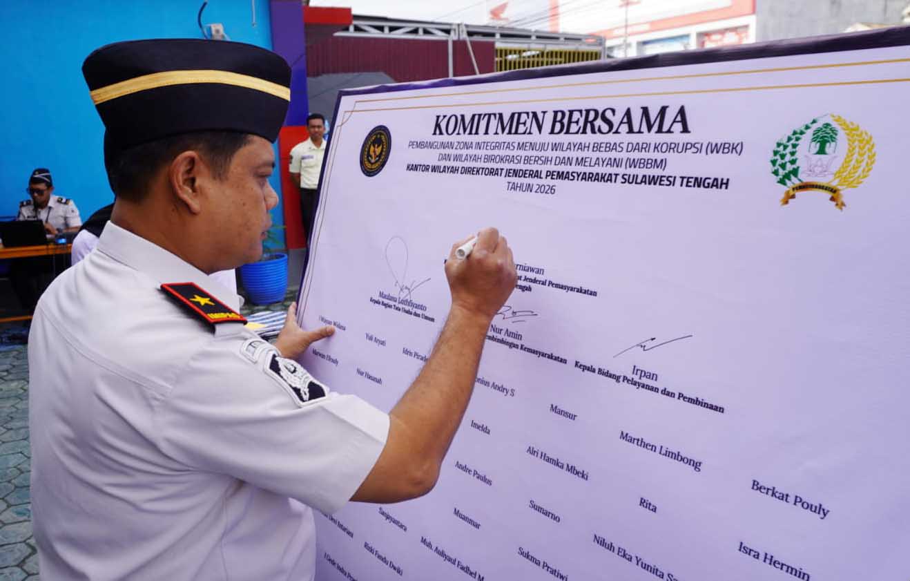 KANTOR Wilayah (Kanwil) Direktorat Jenderal Pemasyarakatan (Ditjenpas) Sulawesi Tengah menegaskan komitmen penguatan integritas dan kualitas layanan publik dengan menandatangani komitmen bersama pembangunan Zona Integritas menuju Wilayah Bebas dari Korupsi (WBK) dan Wilayah Birokrasi Bersih dan Melayani (WBBM).
