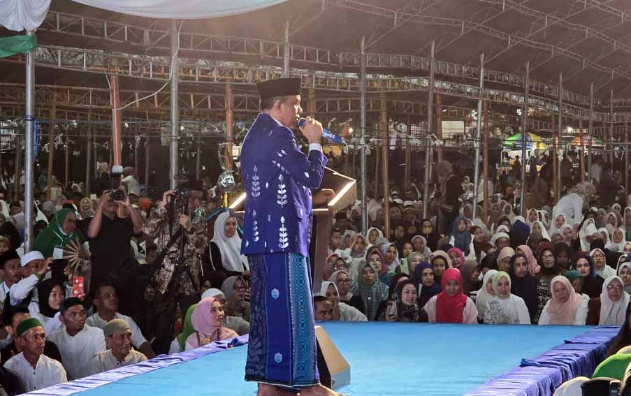 Ketua MCMI Sulteng, Anwar Hafid memberikan sambutan di hadapan ribuan tamu undagan yang hadir pada Maulid Nabi Muhammad SAW di Palu, Rabu (21/9/2024) malam. Foto: Tim Media BERANI