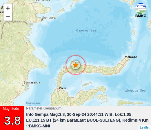 GEMPABUMI dengan magnitudo 3,8 mengguncang wilayah Buol, Sulawesi Tengah, Senin (30/9/2024) malam. Berdasarkan informasi dari Badan Meteorologi, Klimatologi, dan Geofisika (BMKG), gempa terjadi pada pukul 20:44 WIB atau 21:44 WITA.